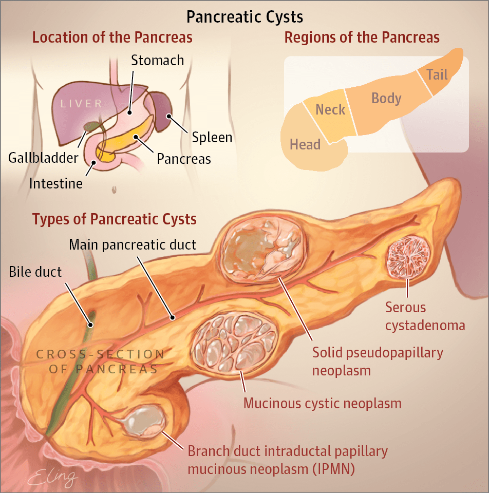 – Pseudocysts: These cysts are typically formed as a result of inflammation or injury to the pancreas. They are filled with fluid, and they are not lined with special cells. (Click here to read more about pseudocysts)