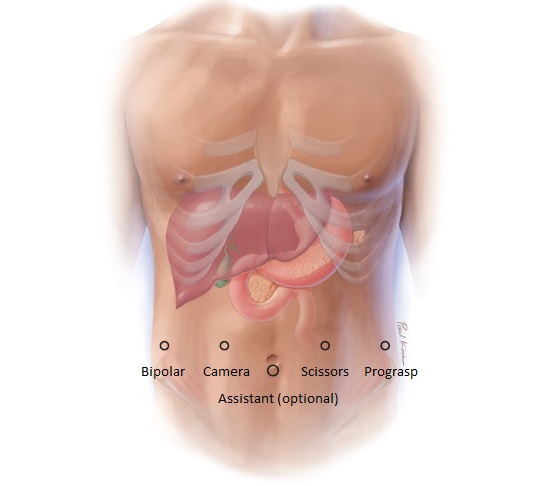 Standard port layout. Supine with 10-12 degrees reverse-T, arms out. Right side up if needed. Entry point at infra-umbilical or LUQ. Arm 1 (bipolar) as far lateral as possible and inferior to liver edge prior to cephalic retraction. Camera and scissors/Vessel Sealer split difference between 1 and 4. Extraction site at arm 3 or infra-umbilical.